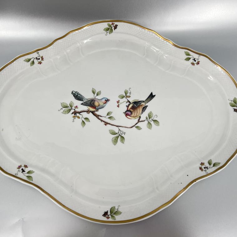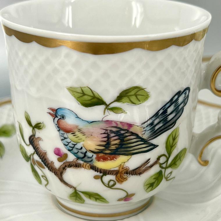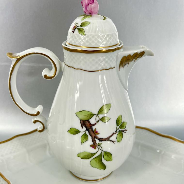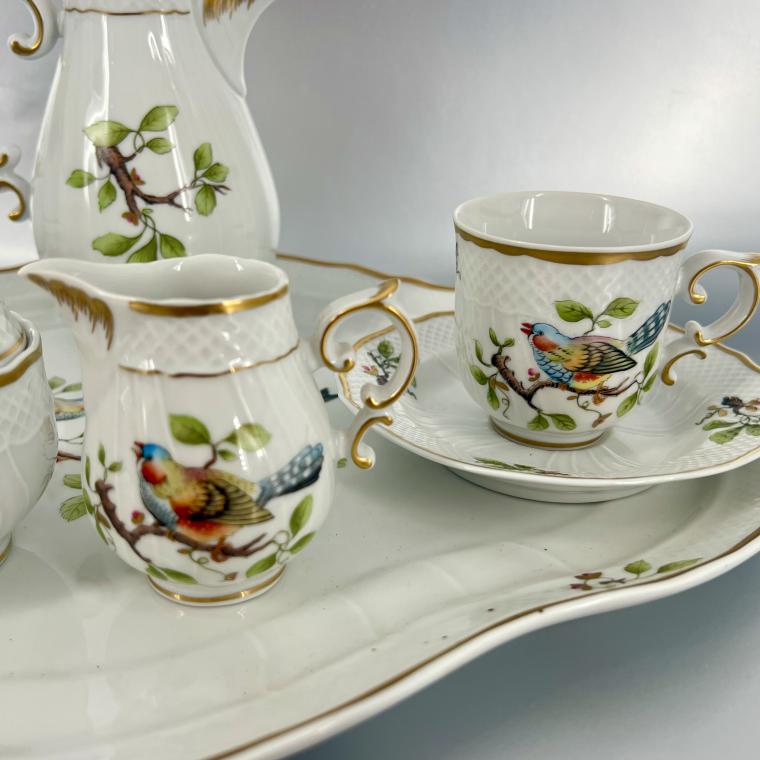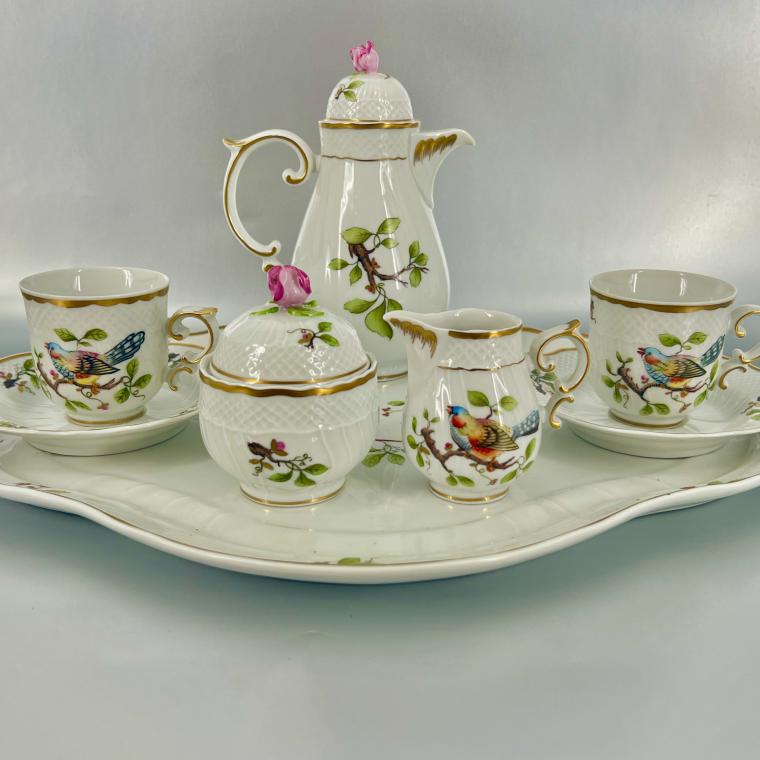 Prachtig gedetailleerd porseleinen tête-a-tête servies. Versierd met mooie motieven van planten, bloemen en vogels. Met de hand beschilderd servies.