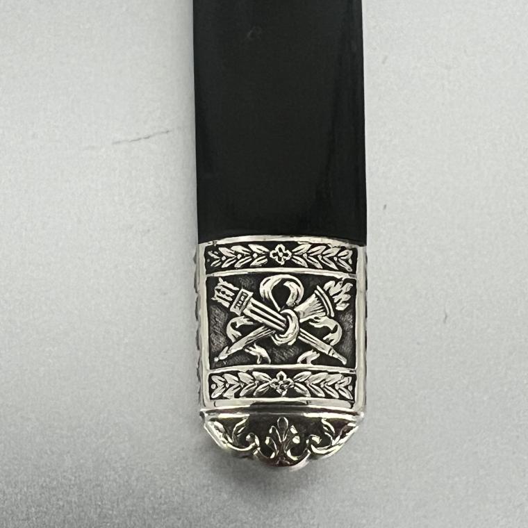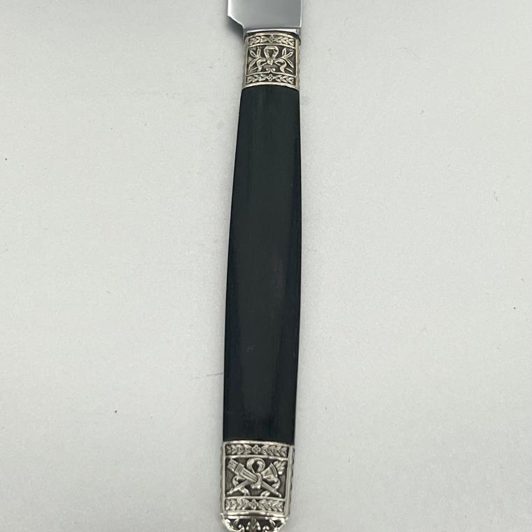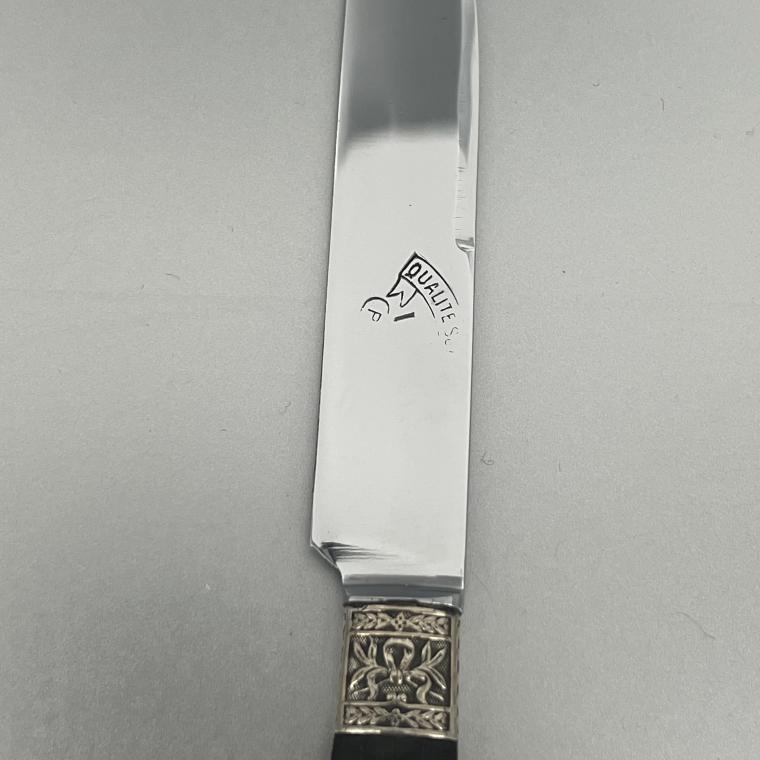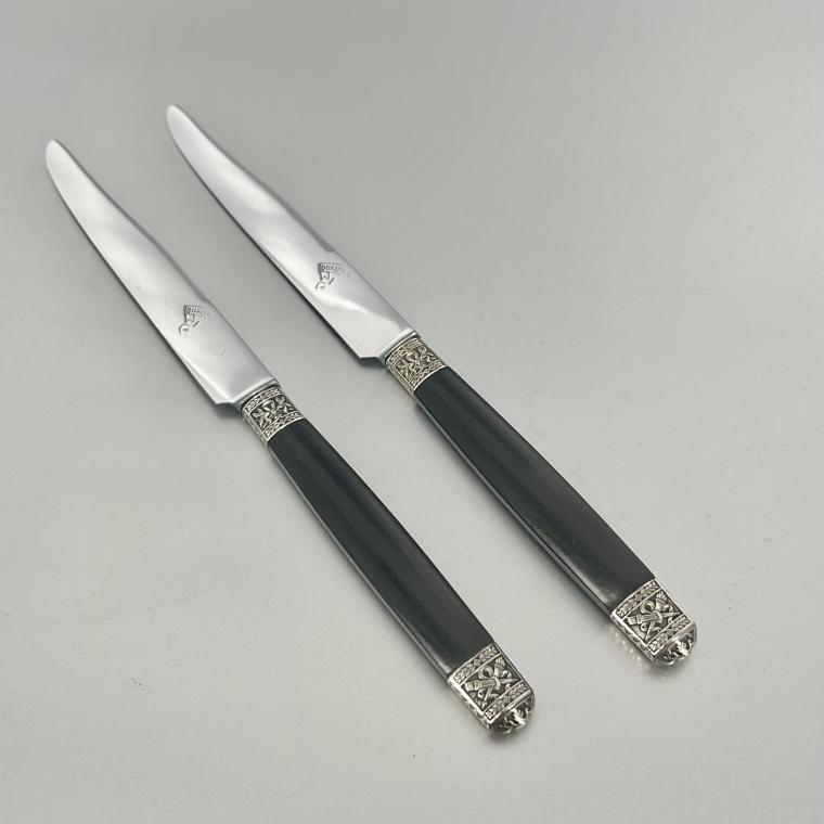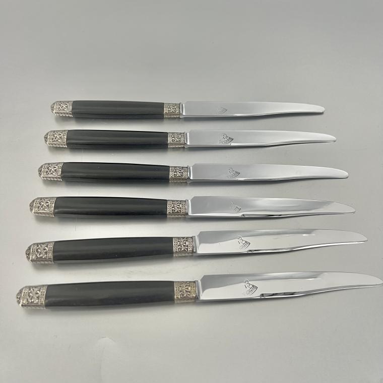 Geweldig leuke dessertmessen, in de Louis XVI stijl. Het zijn 6 messen. De handvatten hebben zilveren elementen.