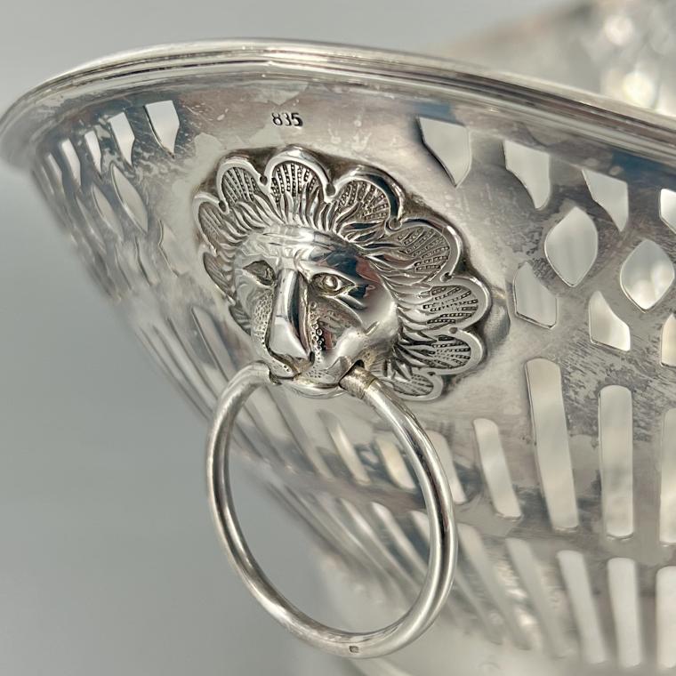 Nederlands zilveren broodmand voorzien van spijlen en leeuwenmascarons.